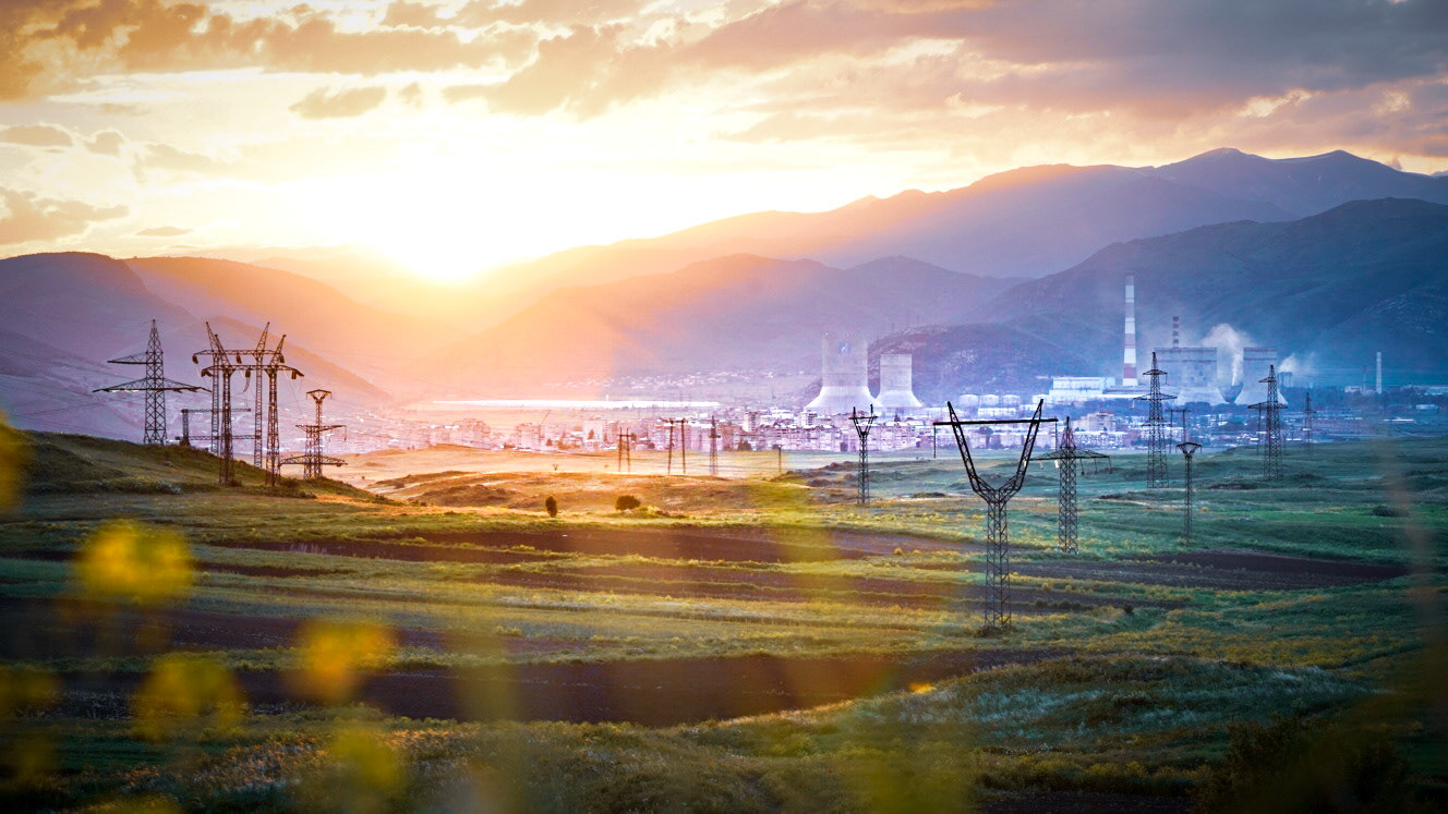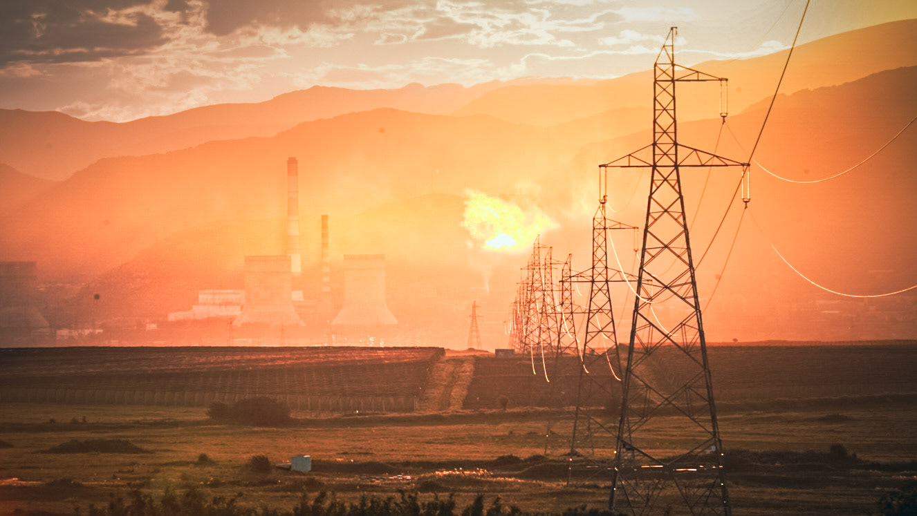 Sunset over the town of Hrazdan with the Hrazdan Thermal Power Plant looming over its skyline